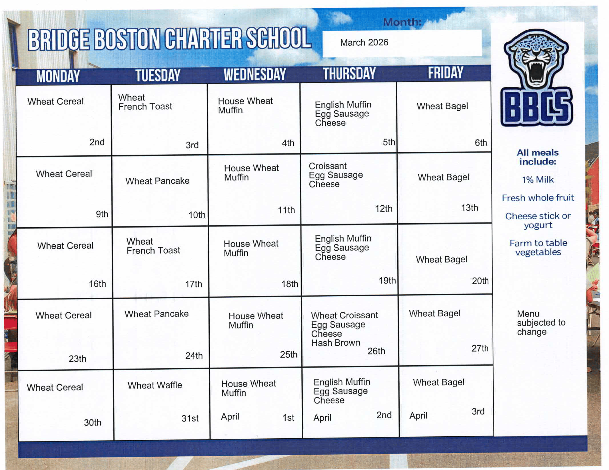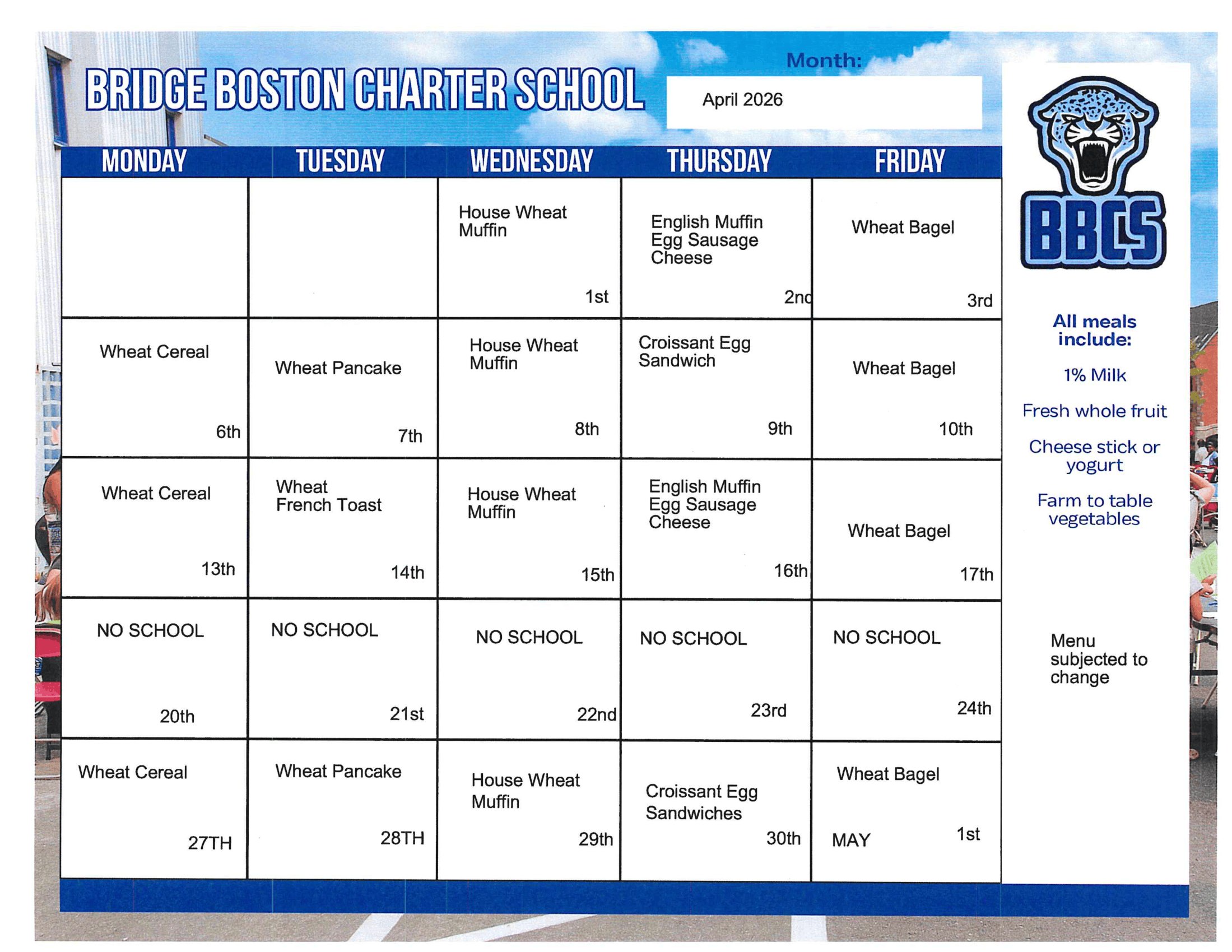 Each month, our kitchen will publish a new breakfast and lunch menu that can be found on this page. For any questions related to our school meals or student nutrition, please email Chef Keverne Glasgow.